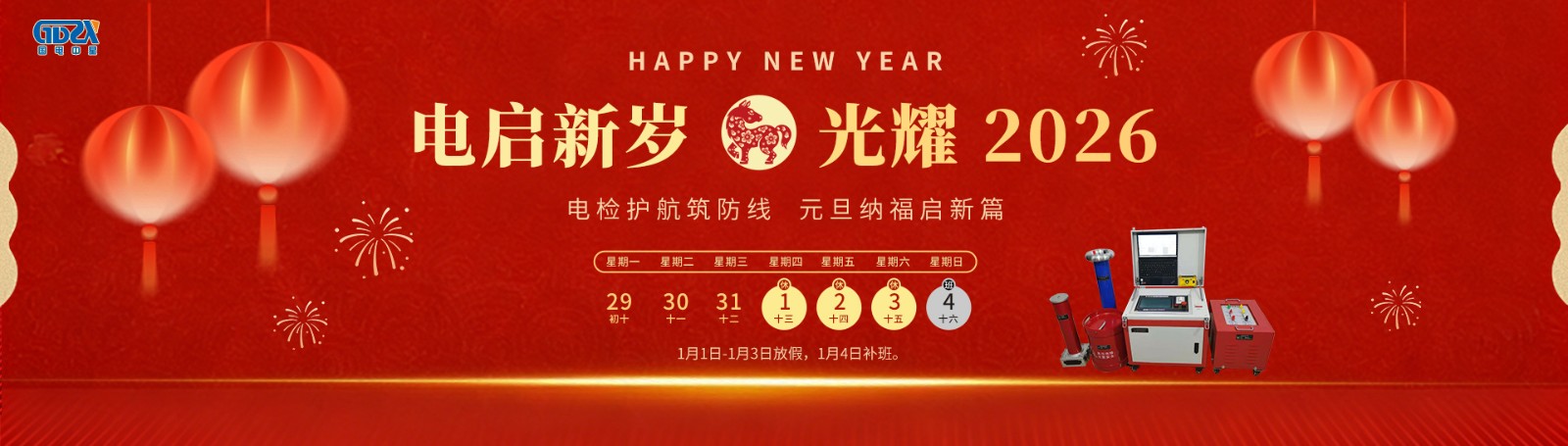 元旦鐘聲送吉祥,喜迎新年新氣象!根據(jù)國(guó)家節(jié)假日安排,結(jié)合公司實(shí)際情況,2026年元旦節(jié)放假安排如下:放假時(shí)間:2026年1月1日-1月3日放假,共3天。1月4日(星期日)正常上班。如有業(yè)務(wù)事宜請(qǐng)與相關(guān)業(yè)務(wù)人員聯(lián)系,相關(guān)聯(lián)系方式如下:1、產(chǎn)品和服務(wù)咨詢熱線:400-0828-027 / 132941535862、電氣試驗(yàn)技術(shù)咨詢熱線:186071457333、售后服務(wù)專線:027-65526006萬象更新迎元旦,愿您新年新起點(diǎn),事業(yè)順?biāo)?,諸事皆圓!——【武漢國(guó)電中星...